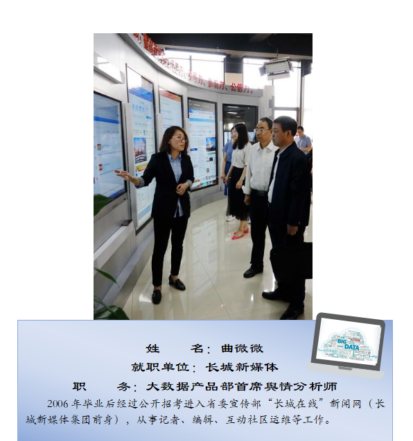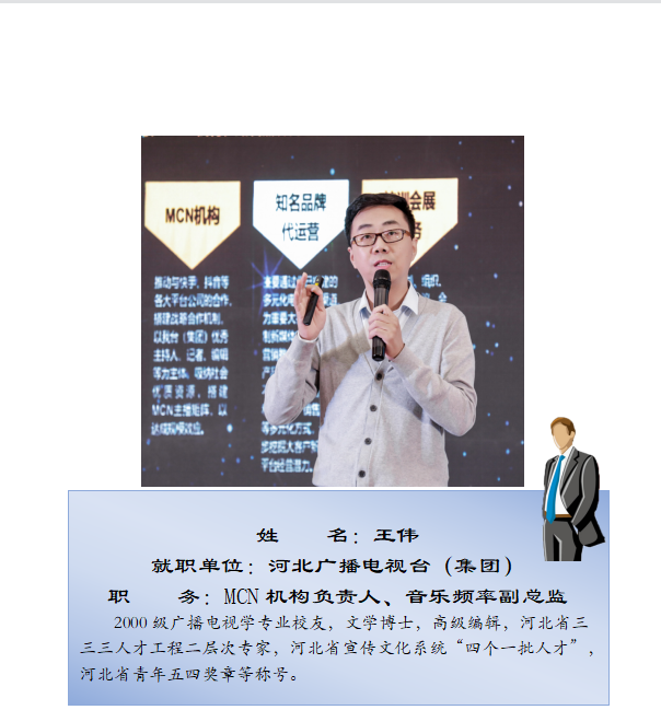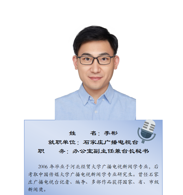 文化与传播学院副教授,硕士生导师,研究方向为视听新媒体、移动传播。先后在报社、电视台、杂志做过记者、编辑,经历从地市级、省级到国家级媒体的跨越。2007年至今,担任河北广播电台、河北电视台节目评议专家,撰写评议文章300余篇。2018年,荣任中央电视台《法律讲堂》栏目签约主讲人。科研成果:2018年,主持国家级虚拟仿真实验教学项目《融媒体新闻制作流程虚拟仿真项目》主持省部级科研项目3项,厅级科研立项10余项,在国内外刊物发表论文30余篇。