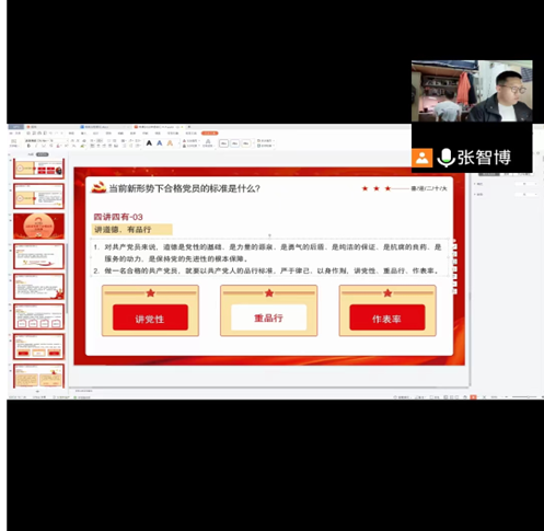 张智博通过带着大家了解做合格党员的三个基本标准,讲解了习近平总书记在新形势下提出的“讲政治、有信念;讲规矩、有纪律;讲道德、有品行;讲奉献、有作为”四个层面的具体内涵,并结合实际阐述了只有讲奉献才能充实人生的道理,进一步强调了青年人的时代使命和担当。