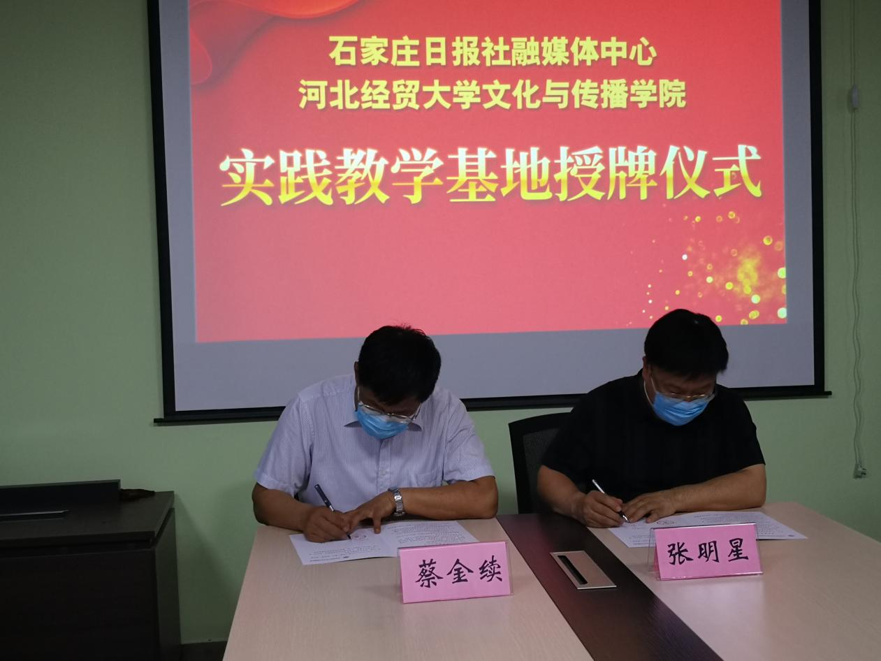 党委书记蔡金续为石家庄日报社融媒体中心、报晓网络科技有限公司“实践教学基地”授牌。双方还就产学研深度合作、校园文化品牌建设、专业实习实践等问题进行了广泛深入的交流座谈。
