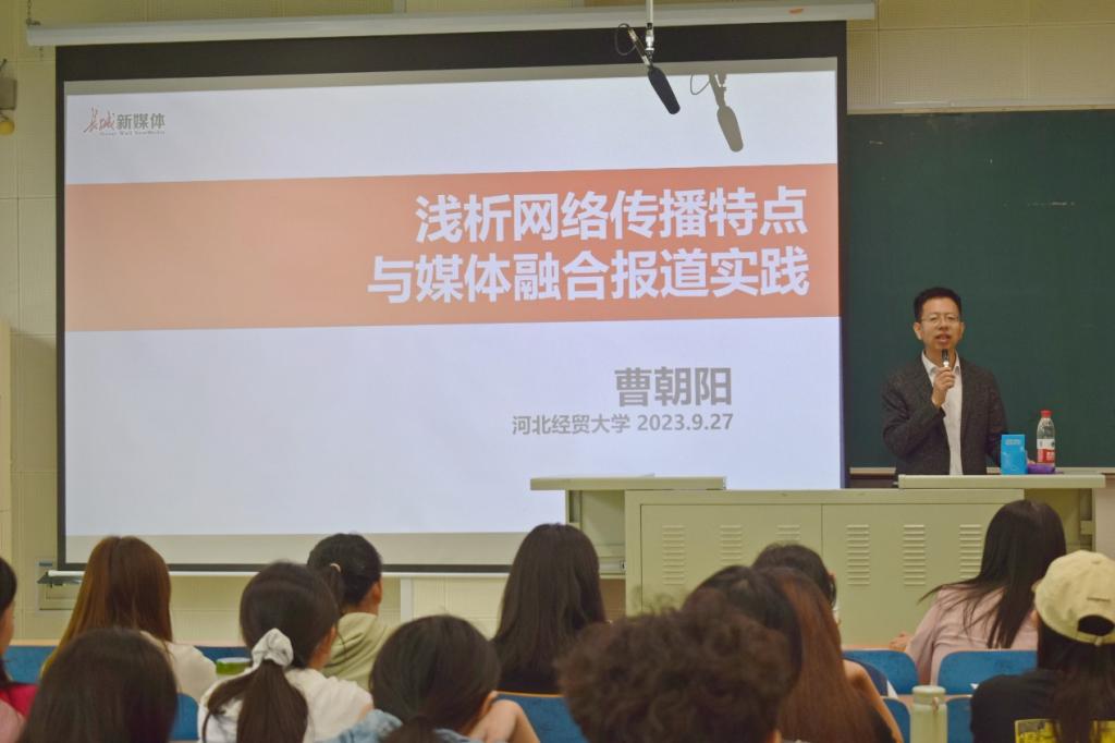 邀请长城新媒体集团时政新闻部、融媒体制作部主任曹朝阳在第三教学楼C310教室作学术讲座,主题为“浅析网络传播特点与媒体融合报道实践”,讲座由院长景义新主持,学院师生120余人参加。