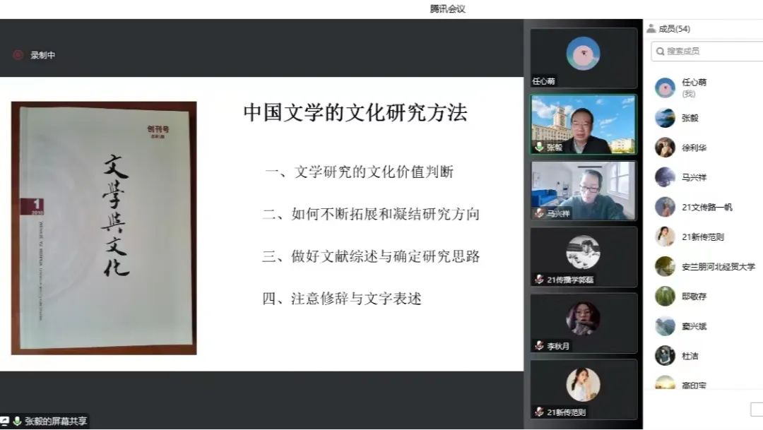 张毅结合自身经验,从确定文学研究的选题、拓展和凝结研究方向、做好文献综述与研究思路、意修辞与文字表达四个方面对中国文学的文化研究方法提出建议。