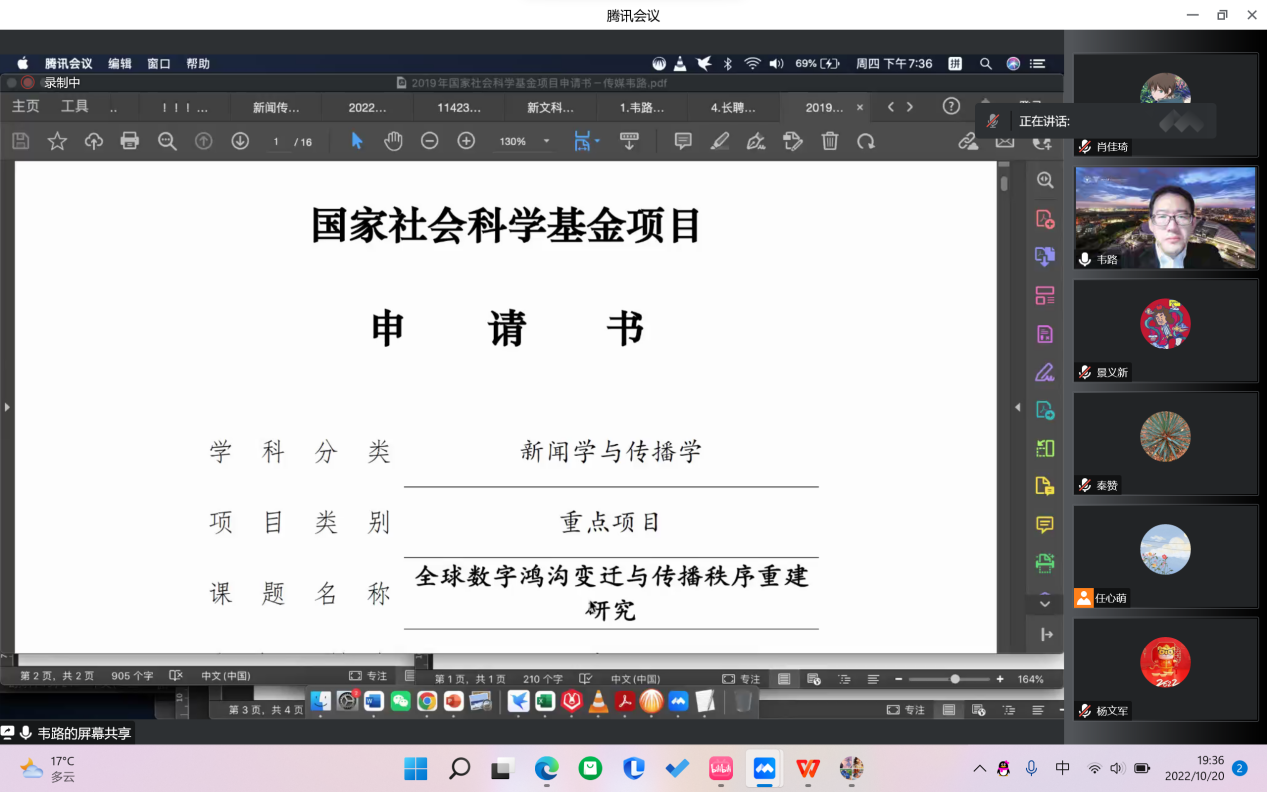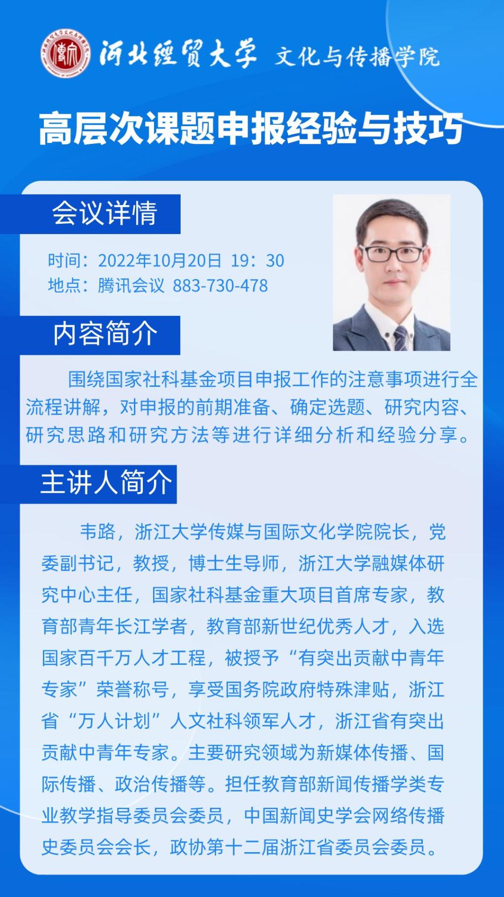 邀请浙江大学传媒与国际文化学院院长韦路教授作题为“高层次课题申报经验与技巧”的线上学术讲座,讲座由院长景义新主持,学院师生共130余人聆听。