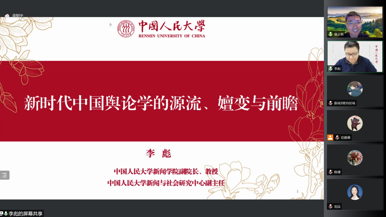 文化与传播学院共同主办的中国新闻传播学公益讲座第十期在腾讯会议线上举行。中国人民大学李彪教授作题为“新时代中国舆论学的源流、嬗变和前瞻”的学术讲座。讲座由文化与传播学院副院长景义新主持,新闻传播学专业教师和学生共300人参加,并通过网络方式同步直播。