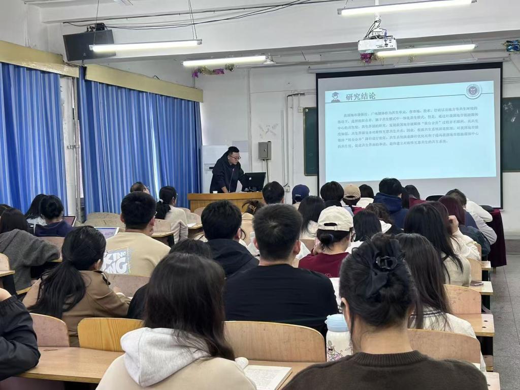 教师邸铭以“共生理论视角下我国地市级媒体‘报台合并’研究”为主题作学术分享,新闻传播学专业教师、研究生共60余人参加。